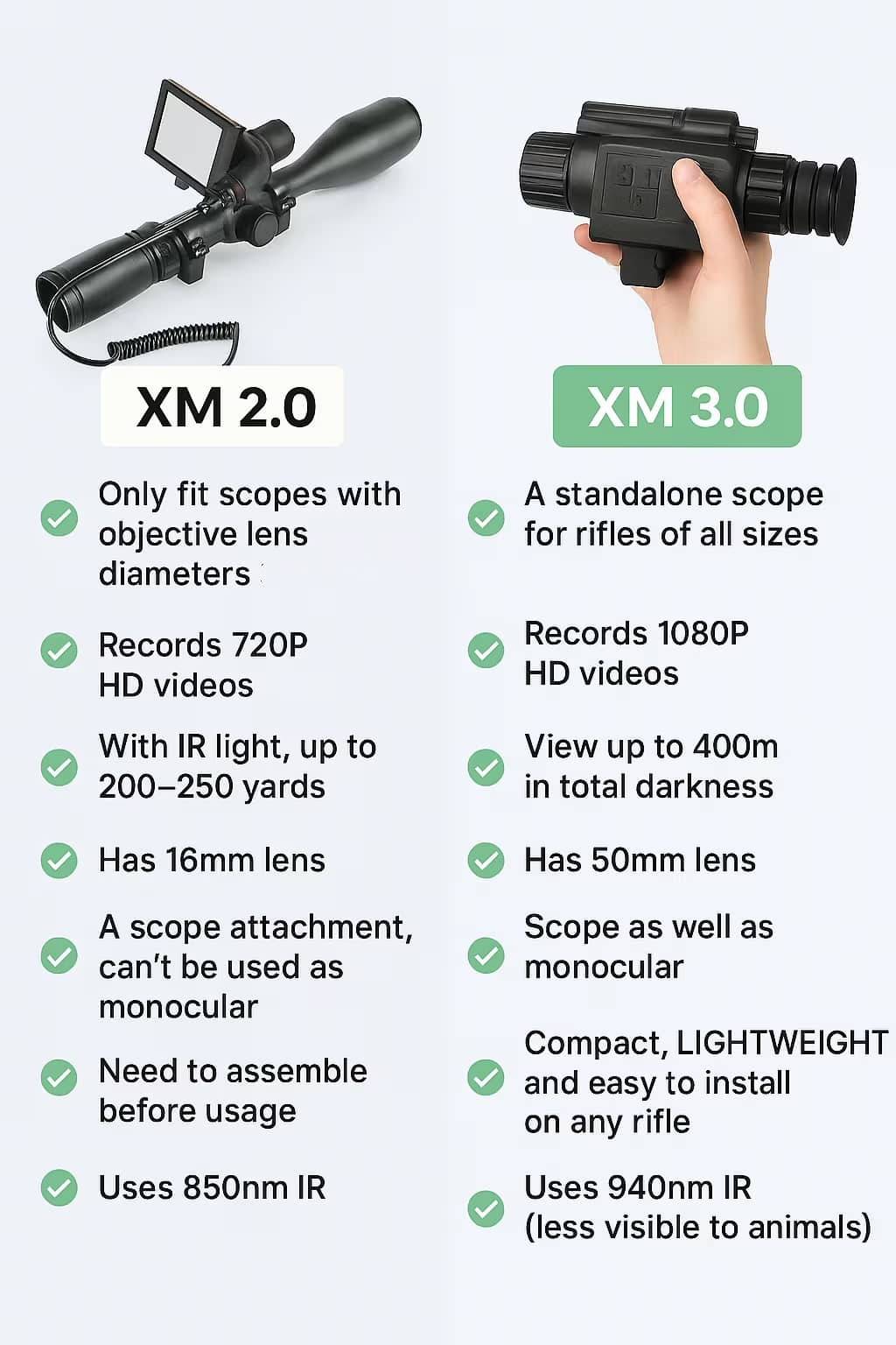 Its advanced 940nm infrared technology ensures visibility without detection, keeping you invisible to animals while providing exceptional clarity. Compared to the previous XM2.0 model with 850nm IR, the XM3.0’s 940nm IR keeps you completely undetectable, ensuring stealth operation in the field.