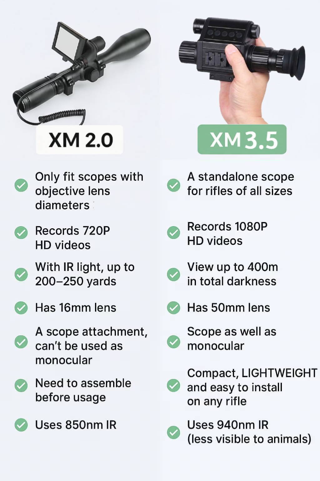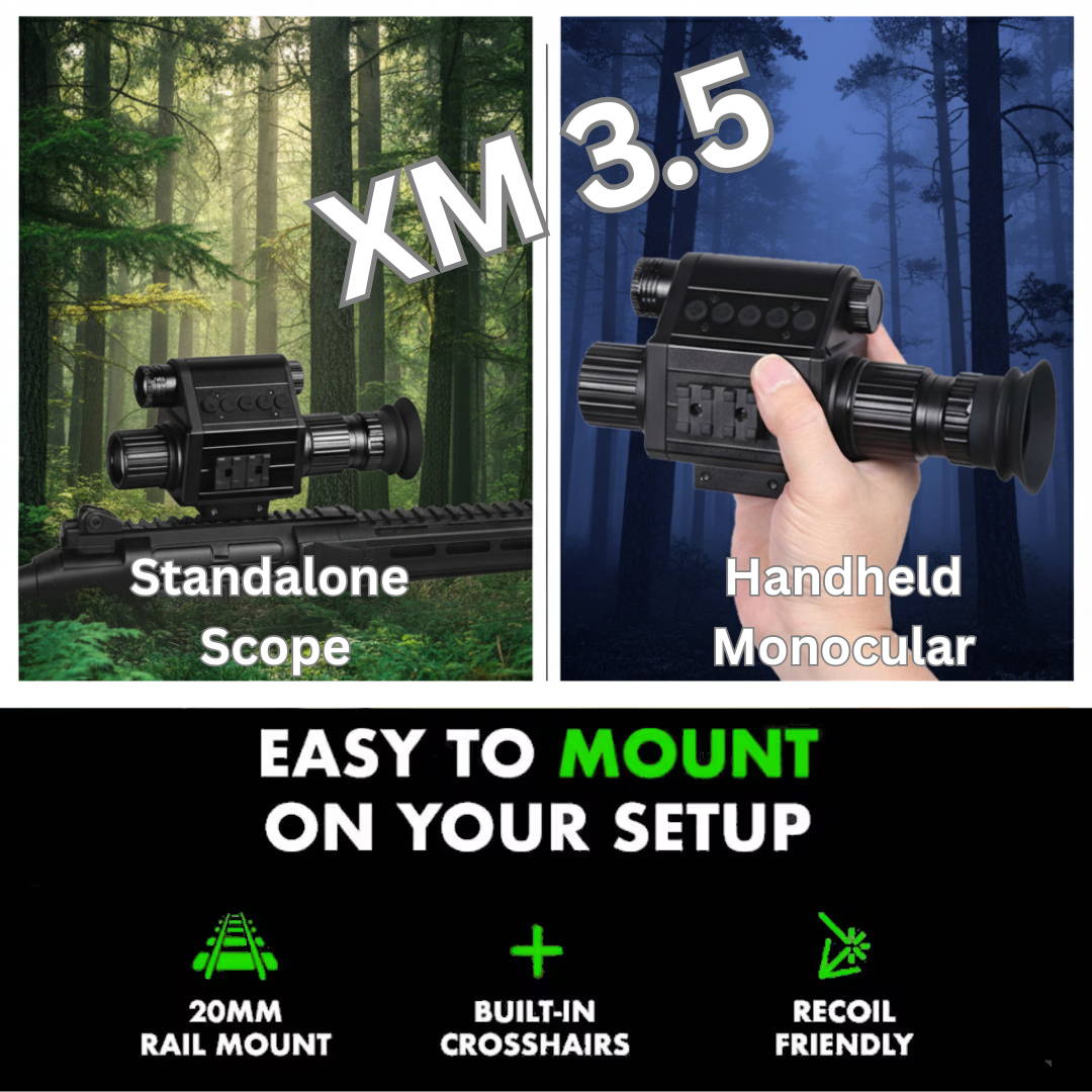 Its advanced 940nm infrared technology ensures visibility without detection, keeping you invisible to animals while providing exceptional clarity. Compared to the previous XM2.0 model with 850nm IR, the XM3.5’s 940nm IR keeps you completely undetectable, ensuring stealth operation in the field.